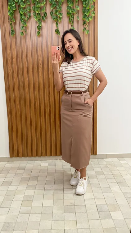 É caracterizada pelo seu corte reto, comprimento midi e pelo uso de tecidos e acabamentos típicos da alfaiataria.