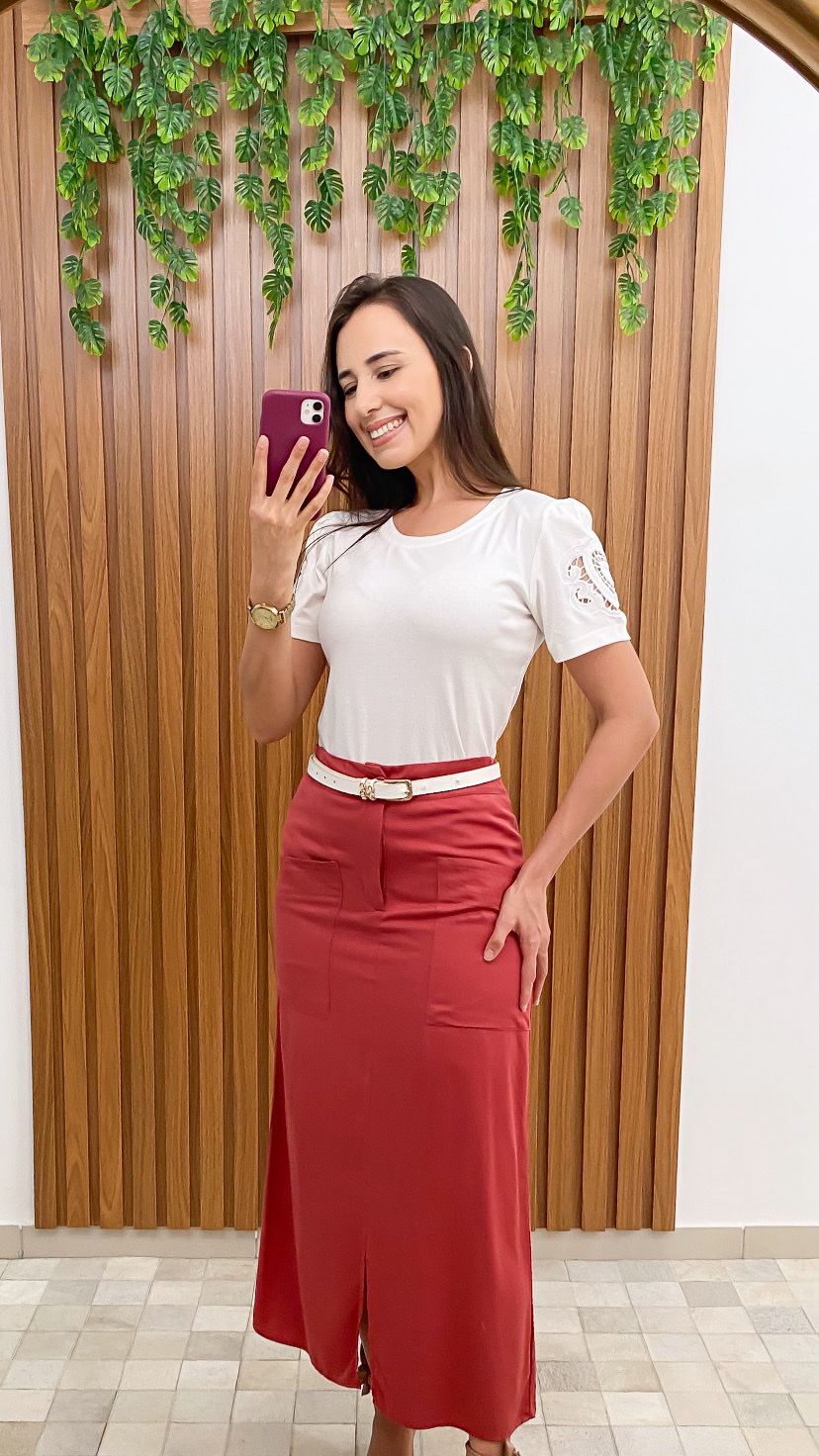 Saia midi na cor terracota, possui um corte levemente evasê, apresenta bolsos e uma fenda frontal, tamanho Único, tecido 1005 viscose. ( não vem com cinto)