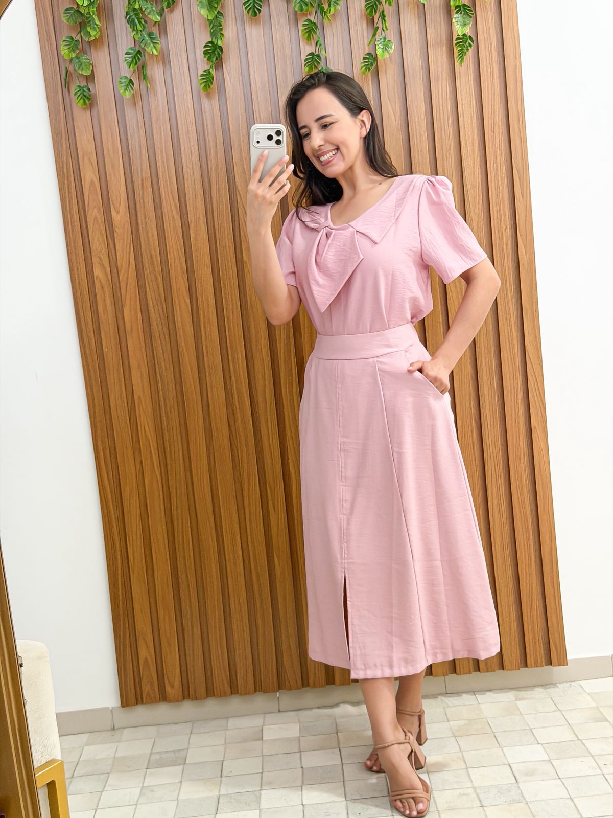 Saia midi rosa pastel, possui corte em linha evasê, que desce suavemente a a partir da cintura, proporcionando um caimento fluido e elegante, possuindo também uma fenda frontal discreta