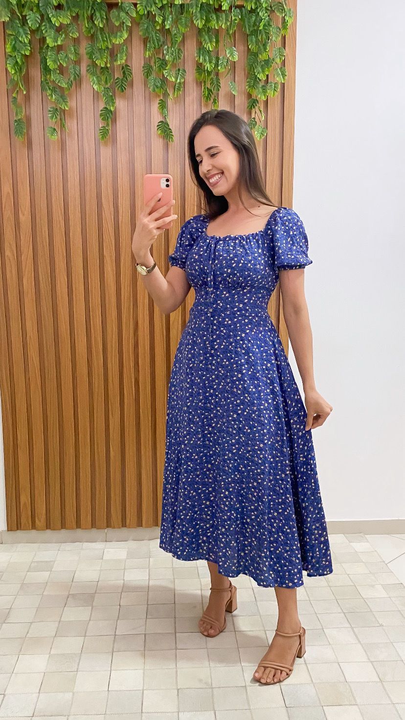 Vestido com estampa delicada, valoriza a silhueta, comprimento midi, modelagem evasê e saia soltinha , apresenta um decote quadrado, mangas curtas levemente bufante, uma peça versátil, tamanho M