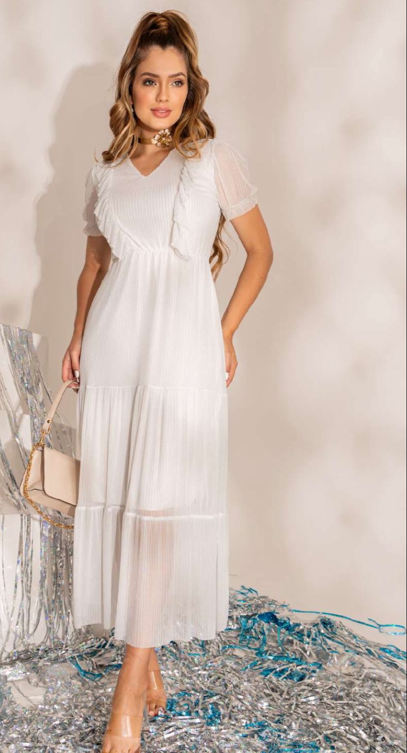 Vestido Branco Midi com listras prata e um leve brilho com babados no busco e manga bufante com lastex na cintura e saias em babado
