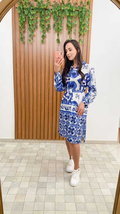 Vestido chamise oversize com estampa em azul com amarração na cintura