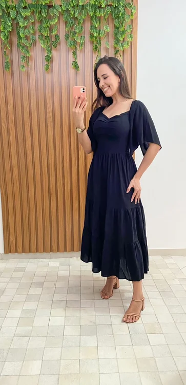 Vestido Preto midi com decote coração, drapeado no busto e mangas amplas tipo borboleta. Ele tem a saia em camadas, que dá movimento e leveza ao look.