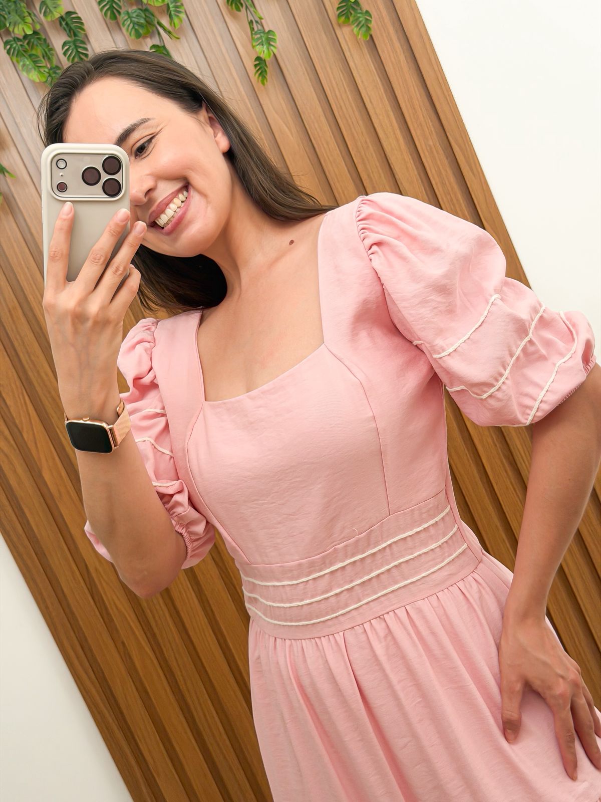 Vestido rosa-bebê com comprimento midi, possuindo um decote quadrado, que valoriza o colo de forma discreta, mangas curtas e levemente bufantes, com acabamento em elástico ou babado suave, estilo três marias, tamanho M