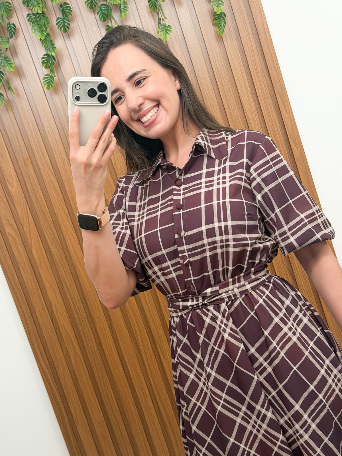 Vestido midi xadrez em tom de marrom, modelo estilo chemise, com gola colarinho e fechamento frontal por botões, mangas com comprimento médio com leve volume estilo princesa, possui cinto para amarração no mesmo tecido, tamanho Único